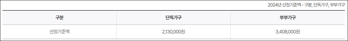 - 소득 요건: 소득인정액이 일정 기준 이하이어야 합니다. 소득인정액은 근로소득, 사업소득, 재산소득 등을 포함하여 산정됩니다. (아래에서 확인)
